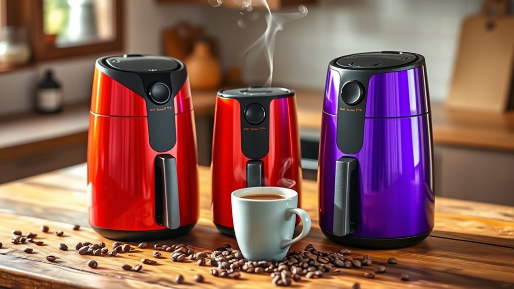 If you’re looking to perfect your coffee roasting at home, consider the Nostalgia Non Stick Stirring Popcorn Maker, which features a built-in stirring rod for even heating. The Elite Gourmet Fast Hot Air Popcorn Popper pops quickly without oil, while the Presto Poplite Hot Air Popcorn Popper is compact and efficient. When choosing an air popper, focus on built-in stirring mechanisms, safety features, and ease of use to enhance your brewing experience. There’s more to discover about making the perfect brew.