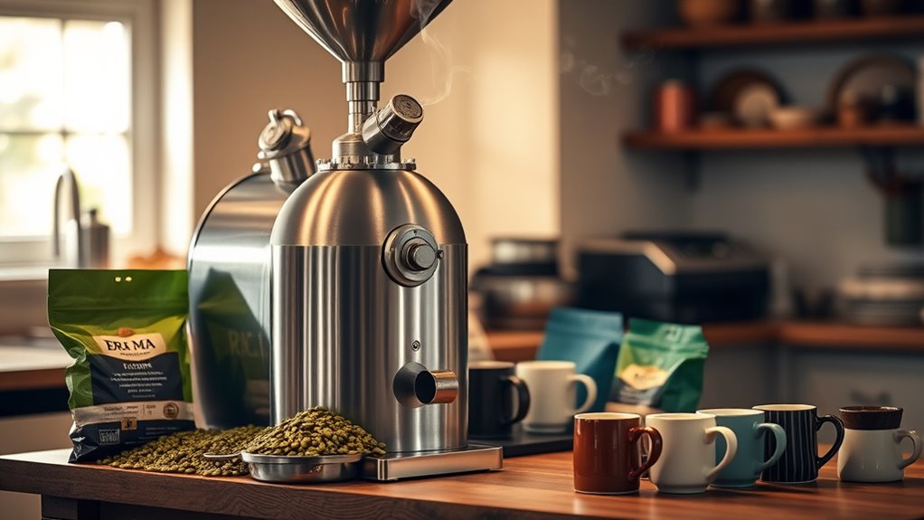 Build quality materials are vital considerations for anyone looking to invest in an at-home coffee roaster. High-quality roasters often use stainless steel for its durability and heat retention, enhancing your roasting experience. If you prefer eco-friendly options, ceramic bodies distribute heat evenly, ensuring consistent roast results without unwanted flavors. Lightweight roasters made from high-temperature resistant plastics offer safety and convenience, but make sure they meet heat resistance standards. Additionally, consider features like corrosion and impact resistance, which contribute to longevity and reliability. The design and materials of components like roasting drums and cooling trays greatly affect heat circulation and chaff collection, which are essential for best roasting performance. Choose wisely to enjoy consistently great coffee.