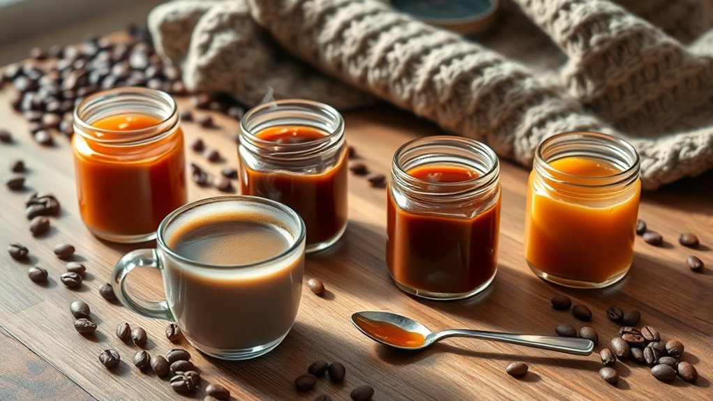 Choosing the right caramel for your coffee involves considering both flavor profile and sweetness, as these factors greatly impact your beverage’s overall taste. Caramel flavors can range from buttery and smooth to rich and decadent, affecting how they enhance your drink. Sweetness levels also vary, with some caramels designed for low-sugar diets, while traditional options may have higher sugar content. Ingredients play a significant role; real caramelized cane sugar offers authenticity, while sugar substitutes provide a guilt-free experience. It’s crucial to find a balance, as overly sweet caramels can overpower coffee’s natural flavors. Thicker sauces deliver a concentrated flavor, while thinner syrups may dilute the taste, influencing your overall experience. Choose wisely for the best brew!