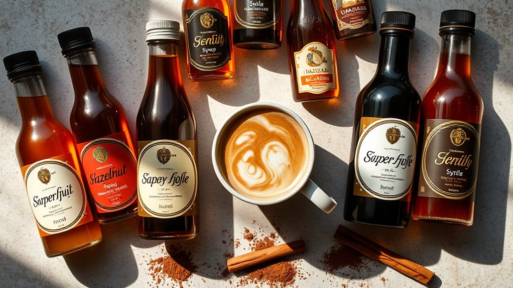 Choosing the right latte syrup can markedly enhance your coffee experience, especially since a diverse flavor selection allows you to customize your drinks to match your taste preferences. You can combine popular choices like caramel with vanilla or hazelnut with chocolate to create your ideal latte. Besides the classics, unique options such as lavender and cookie butter cater to various palates. Many syrup brands also offer seasonal or limited-edition flavors, encouraging you to explore new taste experiences throughout the year. Sampling smaller sizes lets you find your favorites without committing to larger bottles. Plus, these syrups aren’t limited to coffee; they can elevate teas and even cocktails, adding versatility to your beverage options.