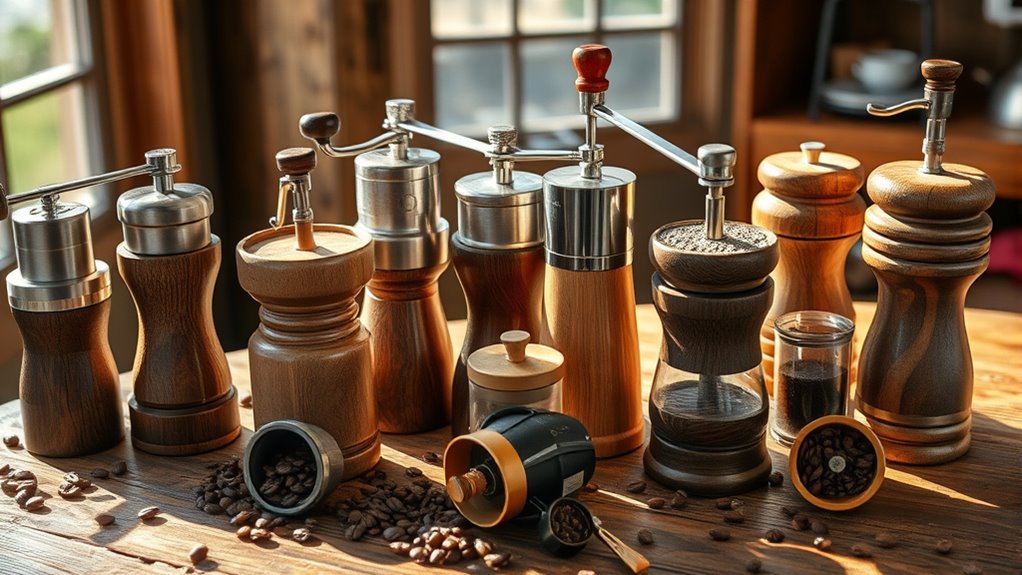 When searching for the best manual grinders for French press coffee, consider options like the TIMEMORE Chestnut C2, known for its durability and consistent grind quality. The KINGrinder K6 offers precise adjustments, while the GCCTXC provides adjustable grind settings for versatility. Look also at the QIYUEXES for portability and the lightweight CEVING grinder. Each grinder has unique features to enhance your brewing experience. There’s more to explore about these grinders and other options that fit your needs.