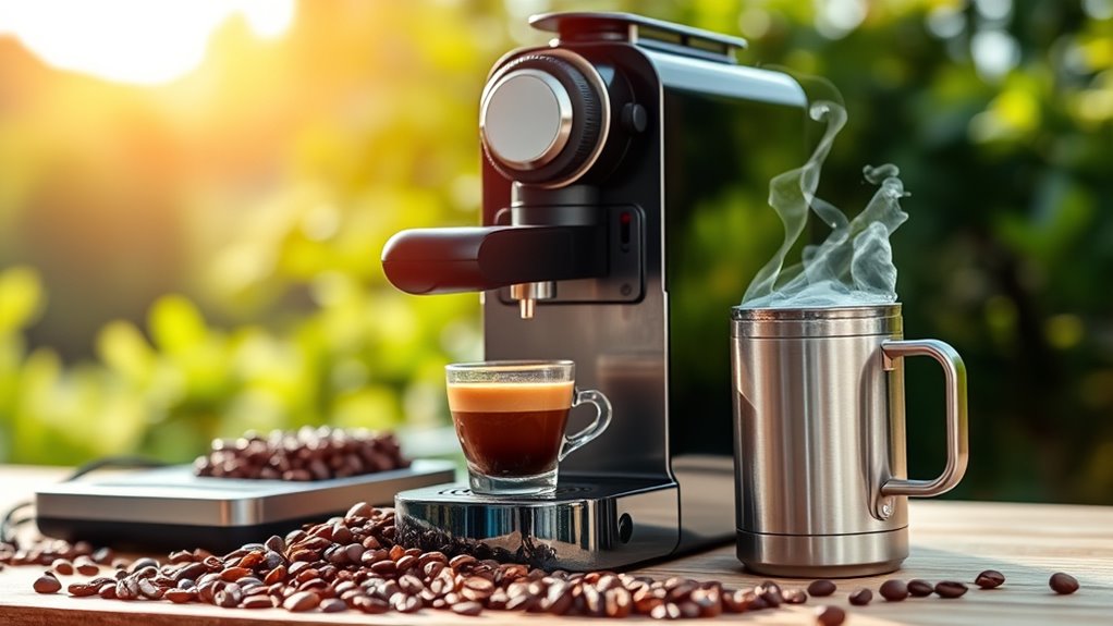 Choosing the right mobile espresso machine often hinges on portability and weight, as these factors play a crucial role in how easily you can transport your equipment. Lighter machines, around 670 grams, make travel or outdoor activities less cumbersome. Compact dimensions, like 2.76D x 2.77W x 9.06H inches, enhance portability, fitting easily into bags or backpacks. A detachable strap can further improve ease of carrying, ideal for hiking or commuting. Although battery-powered machines are convenient since they’re cord-free, consider the battery’s weight and size for overall portability. For road trips or camping, opt for machines designed for easy transport, like those with 12V/24V car adapters, ensuring you can enjoy espresso wherever you go.