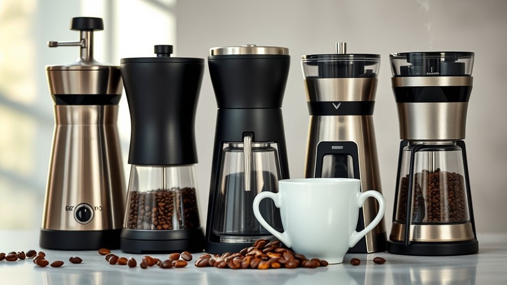 If you’re looking to brew your perfect cup, check out the top-rated coffee grinders of 2025. The Hamilton Beach Fresh Grind offers simplicity and efficiency, while the Conical Burr Grinder features 35 adjustable settings for versatility. For more customization, the Homtone grinder has 51 precise settings. The BLACK+DECKER One Touch is perfect for those who want quick operation, and the OXO Brew combines precision with user-friendly features. Explore which grinder suits you best to enhance your coffee experience.