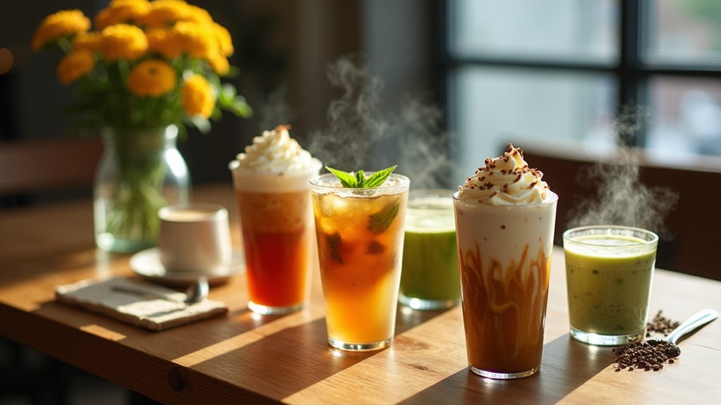 Starbucks offers a delightful range of cappuccino flavors, like vanilla or caramel, that’ll make your taste buds dance! Plus, you won’t have to worry about caffeine overload. Additionally, understanding ingredient ratios can help you customize the perfect low-caffeine drink to suit your preferences.