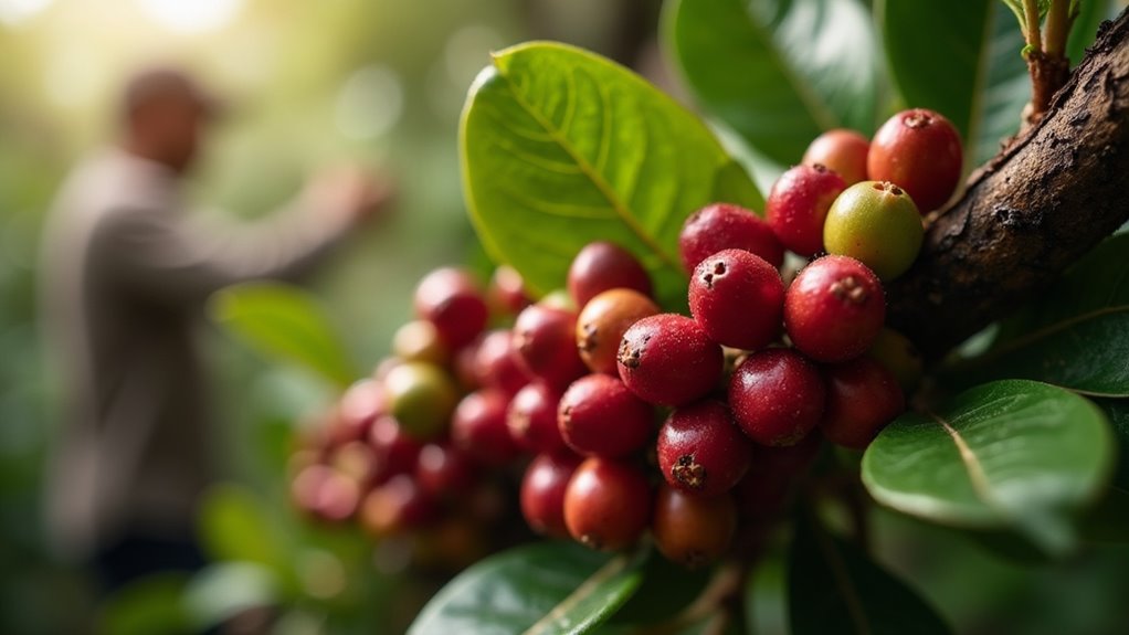 As coffee made its way across the globe, it transformed from a simple berry in Ethiopia to a beloved beverage enjoyed by millions. You’d be amazed at how coffee cultivation and processing developed in various regions. Brazil leads the pack, while Vietnam is the robusta king. Colombia, despite recent challenges, still shines with arabica. In fact, many of the finest Starbucks coffee beans are sourced from these key coffee-producing regions. Check out the journey: